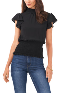 A wide, smocked waist enhances the flattering fit of this scene-stealing blouse with a bold blue hue and fluttery cap sleeves. 25 length Back keyhole with button-and-loop closure Mock neck Cap sleeves 100% polyester Machine wash