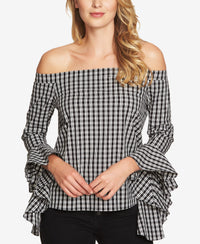 Designed with cascading, ruffled sleeves, this off-the-shoulder top brings romance and drama to any look. Featuring an elasticized neck and easy to pull-on style. Cascade Sleeve Off Shoulder 98% Cotton 2% Spandex Machine Wash and Tumble Dry