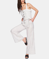 Crisp stripes and a button front combine for an all-in-one sophisticated look with 1.STATE's jumpsuit. Approx. inseam: 28-1/2" Square neckline; button closures a front Self-tie belt at waist Functional side pockets Linen/cotton; lining: polyester Machine washable Imported