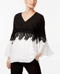 Alfani's bell-sleeve blouse offers an elevated take on casual dressing with chic colorblocking linked by embroidered lace. V-neckline Colorblocked design; embroidered lace detail Long bell sleeves Hits at hip Shell, lining and lace: polyester Machine washable Imported
