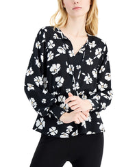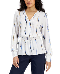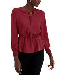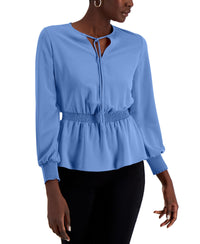 Whether it's work time or down time, this peasant top from Alfani has you covered. Approx. model height is 5'10" and she is wearing a size x-small Approx. 25-3/4" long Split neckline with tassels Smocked at waist and back cuffs; peplum hem Polyester Machine washable Imported Web ID: 13254167