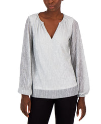 Catch the light in every room in this shimmery metallic top from Alfani designed with pleated detail and long balloon sleeves. Approx. model height is 5'10" and she is wearing a size XS Relaxed fit; Approx. 24-3/4" long Split neckline with pleated detail Metallic detail throughout Balloon sleeves Shell: polyester/metallic threads; lining: polyester Machine washable Imported