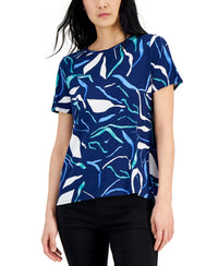 Upgrade your T-shirt look to this Alfani top, a fun printed piece finished with a step hem. Approx. model height is 5'10" and she is wearing a size small Relaxed fit; approx. 24-3/8" long Crew neckline Step hem Rayon/spandex Machine washable Imported , Web ID: 14697445