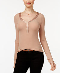 American Rag's ribbed Henley top is your go-to all year round. Shiny trim lining the neck dresses up this casual silhouette. Shiny trim lining Long Sleeves Ribbed henley style Polyester/rayon/spandex