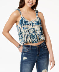 Mix up your style playlist in this tie-dyed crop top from American Rag, complete with ruffled straps and tassel ties at the back. Approx. model measurements: height: 5'9-1/2"; bust: 32"; waist: 25"; hips: 34" V-neckline; tassel tie and button closure at back Tie-dyed; crocheted trim throughout Ruffled straps Hits above waist Rayon; exclusive of trim Machine washable Imported