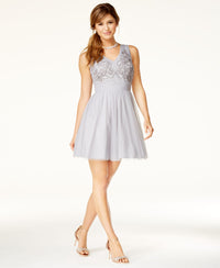 Embroidered and beaded at the bodice. As U wishes silver's party dress captures moonlit hues and the irresistible shimmer of an elegant evening. Zipper closure at back; keyhole back closure Short Length V Neckline; fit & flare silhoutte Molded cups at bodice; ruched at waist Beaded embroidery at front bodice, cutout at back Tulle lining at skirt Polyester Dry clean