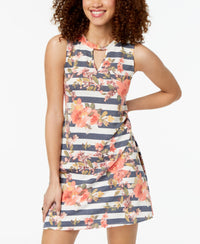 Bold stripes and blossoms lend a '90s feel to a super-soft keyhole dress from BCX. Approx. model measurements: height: 5'9-1/2"; bust: 32"; waist: 25"; hips: 34" Short length; A-line silhouette High scoop neckline with keyhole; pullover styling Unlined Polyester/rayon/spandex Machine washable Imported