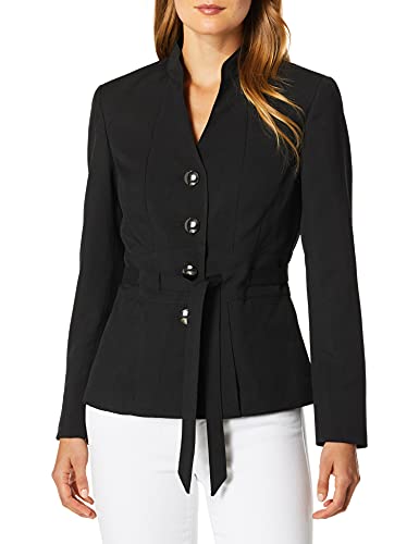 Jacket: approx. 23-1/2" long, stand collar, button closures at front, self-tie belt at waist, belt loops, shoulder pads, lined