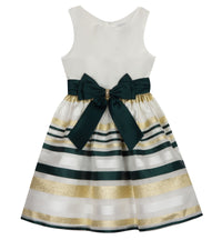 Ivory, sleeveless, mikado bodice to horizontal, multi colored, metallic striped organza skirt, featuring a hunter green satin bow and waistband. Back zip closer Fixed jeweled bow Self tie back tie Dress, Lining - 100% Polyester Hand Wash Imported