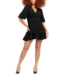 Want a fun & flirty look? Check out Black Tape's ruffled mini dress, defined by a fit & flare silhouette. Approx. model height is 5'9" Approx. 35-1/2" long from center back neck to hem Fitted through the chest and waist; flared and flowing skirt V-neck; Fit & flare silhouette Pullover styling Short puff sleeves Ruffled hem Lined Shell & lining: polyester Hand wash Imported Web ID: 13164235