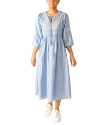 Rich embroidery and tonal crochet trim enhance the artisan-style air of this Black Tape cotton dress that's framed by billowy volume sleeves. Approx. 45-1/2" long from center back neck to hem Split round neckline with tasseled ties Button closure at back neckline keyhole Volume 3/4-sleeves with embroidered detail Embroidery at front bodice; crochet lace trim at bodice and waistline Lined Shell: 100% cotton; lining: 100% cotton Machine washable Imported