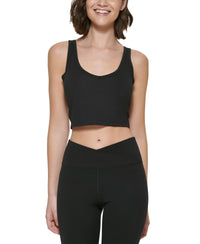 A strappy crop top from Calvin Klein Performance makes a cool alternative to your usual workout wear. Approx. 15" long; fitted; cropped hem Low impact sports bra ideal for yoga, Pilates or lounging Rounded V-neck; shelf bra; crisscrossing strappy back Polyester/spandex Machine washable Imported