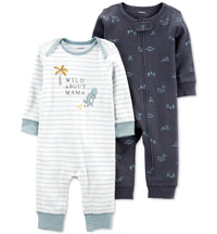 Perfect for those cooler nights, these dinosaur jumpsuits will keep your baby boy feeling snuggly, thanks to their all-cotton construction. 2-pack Zip-front design; snaps at the legs for easy changes; footless All cotton Machine washable Imported