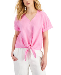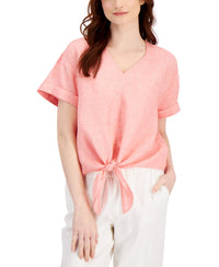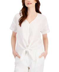 A cute tie brings fresh flair to this Charter Club top, in woven linen for lasting style. Approx. model height is 5'10' and she is wearing a size medium Approx. 22" long Due to generous sizing, we suggest sizing down for the perfect fit V-neck Tie at hem Linen Machine washable Imported Web ID: 13566830