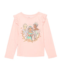 Look adorable in this long sleeve T-shirt featuring your favorite Disney princess characters. Ruffle shoulder style Front graphic print Gold-tone glitter Cotton, Polyester Machine Washable Imported