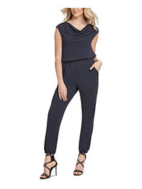 DKNY dresses up this jumpsuit with an elastic waist and cowl neckline. Gorgeous with a stiletto heel, you can also style it for the day with cute flats. Approx. inseam: 29" Cowlneck; hidden back zipper closure Elastic waist; banded hem Cap sleeves Polyester Machine washable Imported Web ID: 9887203