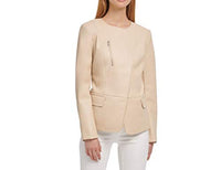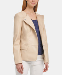 Go beyond basic with DKNY's asymmetrical-front jacket styled in faux leather for a polished look. The collarless neckline adds a sleek touch. Approx. length: 21" Crewneck; zipper and snap closures at front Asymmetrical front Zip pocket at chest; two front pockets Lined Faux leather: polyurethane; lining: polyester Spot clean only Imported Web ID: 8744269
