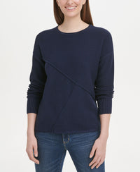 Pieced details create a mixed-media edge on this effortlessly stylish boat-neck sweater from DKNY. Hits at hip; approx. length: 25-1/2" Boat neckline Ribbed cuffs; pieced bodice All cotton Machine washable Imported