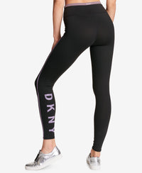 Contrast striping and logos make DKNY's high-waisted leggings a sporty choice for active days or just relaxing. High rise; slim fit through hips and thighs; skinny leg Approx. inseam: 31" Pull-on styling with wide elastic waistband Contrast trim at back waist and sides of legs; screen print logos at back waist and leg Nylon/elastane Machine washable Imported