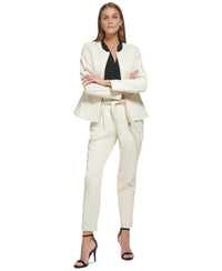 Shake up your work week with this faux leather blazer from DKNY, featured with a zip front closure for endless styling options. Approx. model height is 5'10" and she is wearing a size 6 Approx. 23-1/2" Collarless; zip front closure Shoulder pads Polyurethane/polyester; lining: polyester Dry clean Imported