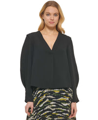 Figure-flattering in all the right ways, this polished V-neck blouse from DKNY boasts a modern cropped cut. Model is wearing a size small Relaxed fit; approx. 22" long V-neck Shoulder details Long balloon sleeves with pleated detail Polyester Machine washable Imported Web ID: 14607418