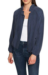 1.STATE takes a flyer on the traditional bomber jacket by relaxing the shape with ruching and drawstrings and softening the feel with comfortable cupro fabric. Hits at hip Ruffle-trimmed neckline band with drawstring; zipper and snap closure at front Drawstring with looped ties at hemline Snapped slash pockets at side-front Raglan long sleeves with ruching at wrists Cupro Hand wash Imported Web ID: 8296502