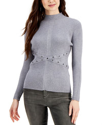 Bold grommet details make this ribbed long-sleeve sweater from Fever a knock-out addition to your cool weather wardrobe. Mock neck Grommet details at front Rayon/polyester/nylon Hand wash Imported Web ID: 12921789