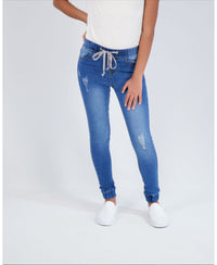 Easy, soft and superior comfort denim jogger from Gogo Star features a novelty tie at waistband in a medium light wash. Elastic waist with tie closure 5 pocket design, featuring belt loops Light destructed at front legs Cotton/polyester/spandex Machine washable Imported