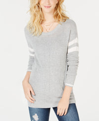 Perfectly placed stripes instantly elevate the appeal of this soft and stretchy scoop-neck sweater from Hippie Rose. Approx. model height is 5'10" and she is wearing a size medium Hits below hip Scoop neckline Striped detail at sleeves Varsity Detail featured on The It List Rayon/nylon Hand wash Imported