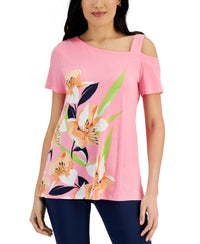 Beautiful florals bloom across this partial cold-shoulder top from JM Collection. Approx. model height is 5'10" and she is wearing a size small Relaxed fit; approx. 25-1/2" long Due to generous sizing, we suggest sizing down for the perfect fit Cold-shoulder sleeves Polyester/spandex Machine washable Imported Web ID: 13708405