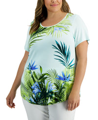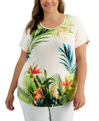 A lush print adds a tropical feel to JM Collection's plus size short-sleeve top. Approx. model height is 5'10" and she is wearing a size 1X Approx. 26" long Scoop neckline Rayon/spandex Machine washable Imported Web ID: 13807803