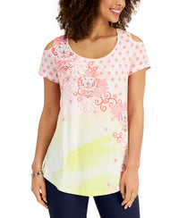 JM Collection Womens Printed Cold-Shoulder Top