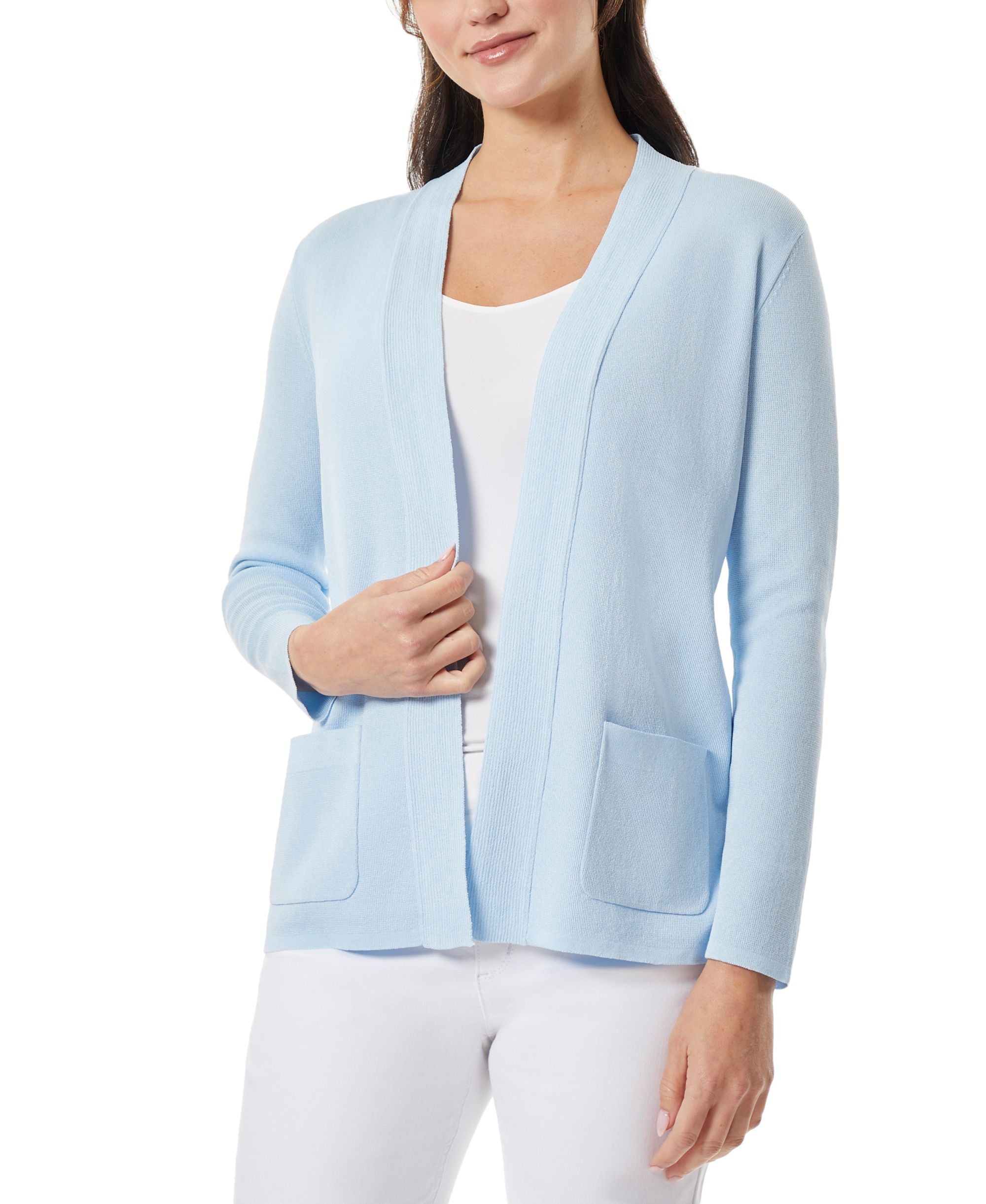Being offered in all of the best basic colors, this Jones New York Open Front Cardigan Sweater is the perfect third piece to pair with any outfit. With a ribbed placket detail and patch front pockets, you'll stay effortlessly styled.