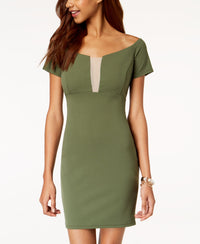 Jump updates a bodycon silhouette with a sultry off-the-shoulder neckline finished with short sleeves. The front of the bodice features a sheer mesh inset, too. Approx. model height is 5'10" and she is wearing a size 7/8 Short length; bodycon silhouette Off-the-shoulder neckline; back zipper closure Sheer mesh inset at bust IMPORTANT NOTE: This item arrives with a return tag attached and instructions for removal. Once the tag is removed from the dress, this item cannot be returned. Polyester/spandex; lining: polyester; trim: polyester Machine washable Made in USA