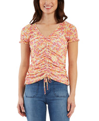 BCX makes it simple to customize your look: just cinch the drawstrings for more ruching on this cute printed top. Approx. 21" long V-neck Ruched at front; drawstrings at hem Puffed cap sleeves Polyester/spandex Machine washable Imported