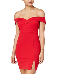 A romantic off-the-shoulder design and an alluring slit at the hem define this curve-hugging, statement-making bodycon dress from Speechless. Hidden back zipper closure Approx. model measurements: height: 5'9-1/2"; bust: 32"; waist: 25"; hips: 34" Short length Off-the-shoulder sweetheart neckline; bodycon silhouette Seamed surplice details at front; molded cups Slit at side hem Lined bodice; unlined skirt IMPORTANT NOTE: This item arrives with a return tag attached and instructions for removal. Once the tag is removed from the dress, this item cannot be returned. Polyester/spandex; lining: polyester Hand wash Imported Web ID: 5390994
