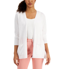Karen Scott brings modern everyday style with this fashionable take on the open-front cardigan. Relaxed fit Due to generous sizing, we suggest sizing down for the perfect fit Open front Two patch pockets; ribbed top of pockets and hem Rayon/polyester Machine washable Imported ,