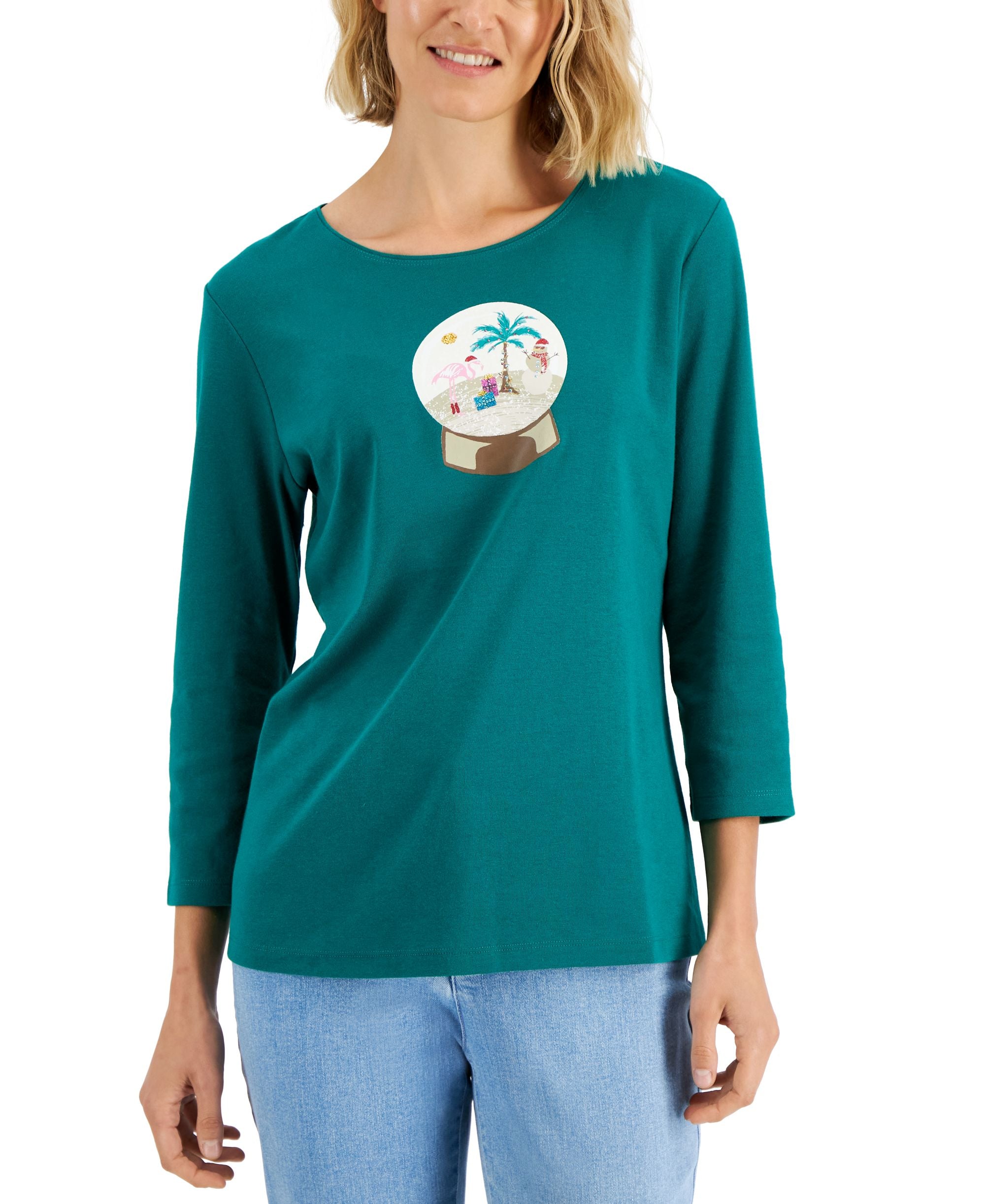 Get ready for the holidays with these whimsical printed designs that take center stage on this petite 3/4-sleeve top from Karen Scott.