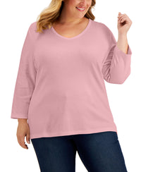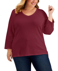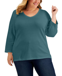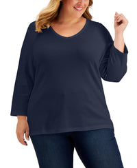 Upgrade a stylish staple and refresh your wardrobe with this plus size 3/4-sleeve top from Karen Scott. The solid print provides the perfect backdrop to showcase stylish accessories and highlight your fashionable flair. Model is wearing a size 1X Relaxed fit; hits at hip; approx. 28" long V-neck 3/4-sleeves By choosing cotton products from this brand, you're supporting investment in Better Cotton's mission. This product is sourced via a system of mass balance and therefore may not contain Better Cotton Cotton/polyester Machine washable Imported Web ID: 12677734