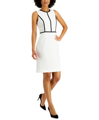 Contrast trim outlines the bodice of this sleeveless sheath dress from Kasper, a polished pick that's perfect for the office. Approx. 38-3/4" long from center back neck to hem. Length is based on size 8. Tailored fit through the chest, waist, and hips; sits close to the body Scoop neckline; Sheath silhouette Back zipper closure Contrast trim at bodice Lined Shell: polyester/elastane; lining: polyester Dry clean Imported Web ID: 13668191