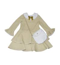She will shimmer with every twirl in this darling lurex-stripe dress from Blueberi Boulevard, featuring a plush collar and ruffled sleeves followed by a tiered skirt, and aptly adorned with a gold-embroidered strap and plush flap purse for a luxe finish. Set includes- 1 dress, 1 attached purse Long sleeve Round neck Flare skirt with double tier ruffle Gold-tone glitter bow Polyester, Metallic, Nylon, Spandex Hand Wash Imported