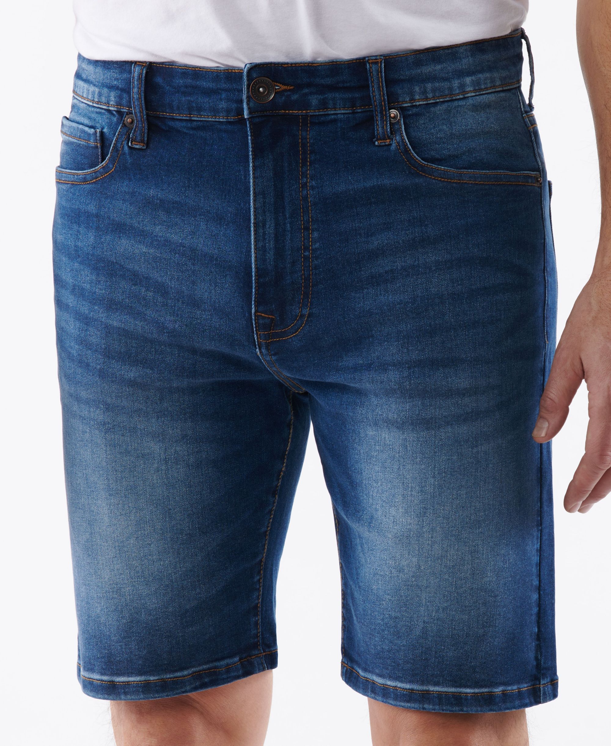 Timelessly Cool. Authentic and functional. Our denim transcends trends. The Lazer Slim Fit Short is an essential streamlined fit. Mid rise with a slim leg that hits at the knee. The authentic denim fabric has stretch for all day comfort. Features a traditional 5-pocket styling with button and zip closure. Quality denim curated in NYC.