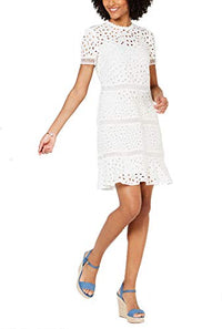 Gift your wardrobe with an ultra charming look in Michael Michael Kors' cute dress, covered in eyelet embroidery and complementary trim. Approx. 36-3/4" long from center back neck to hem. High neckline Hidden back zipper closure Eyelet embroidery throughout; circle trim at neckline Lace insets at cuffs, waist and skirt Cotton; lining, binding and lace: polyester Dry clean Imported