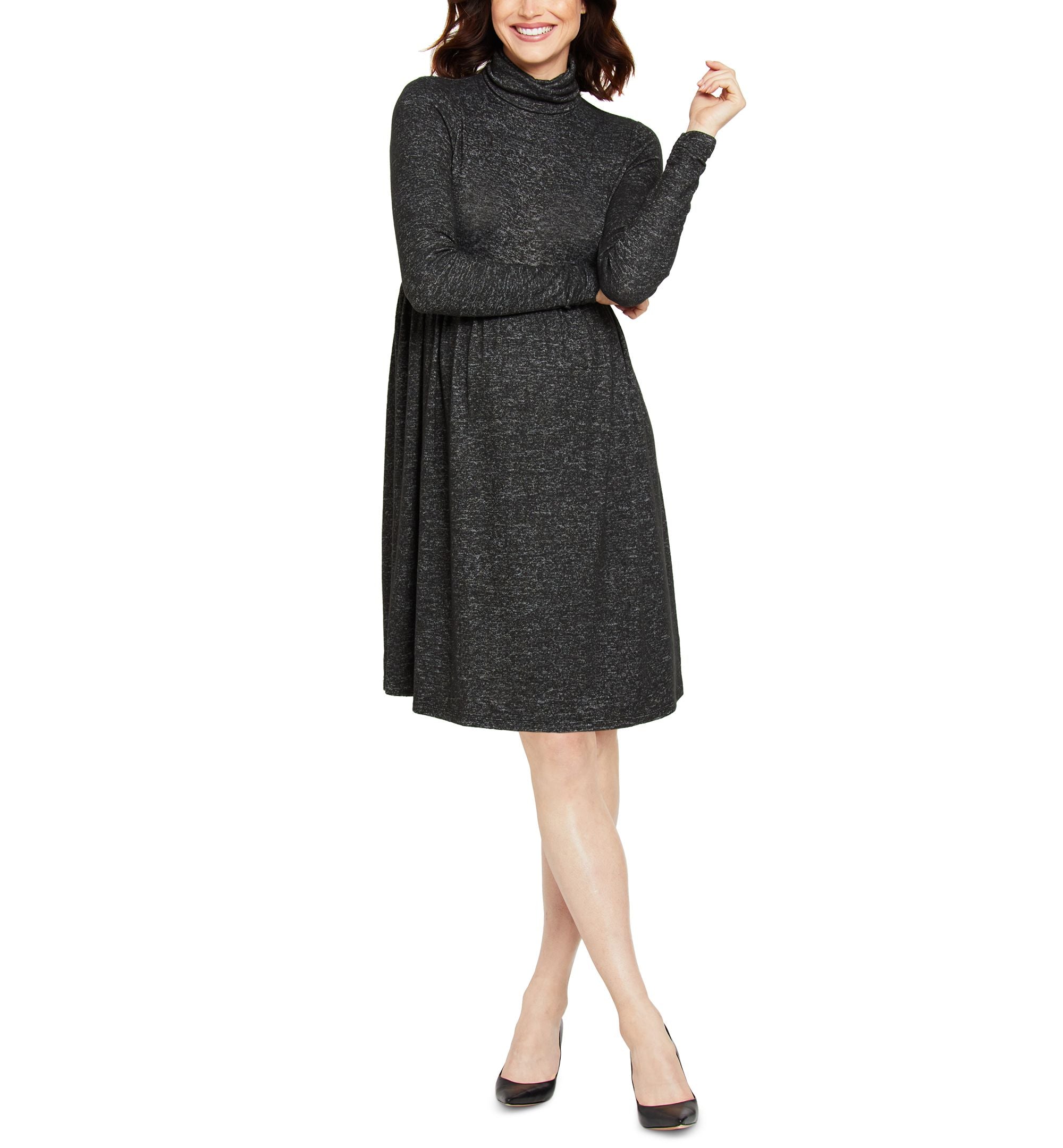 Motherhood Maternity's sweater-inspired maternity dress is designed with a cozy turtleneck and a flowing fit & flare silhouette.