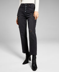 And Now This delivers chic denim style with these mom jeans designed with plenty of edgy rips and an exposed button fly.