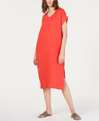 Eileen Fisher goes laid-back in organic cotton with this crinkle-texture dress in a breezy pullover silhouette. Approx. 45" long from center back to hem. V-neck Pullover style Side slits Unlined All cotton Hand wash Imported Web ID: 8393102