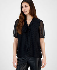 Petite Clip-Dot Tie-Neck Short-Sleeved Blouse