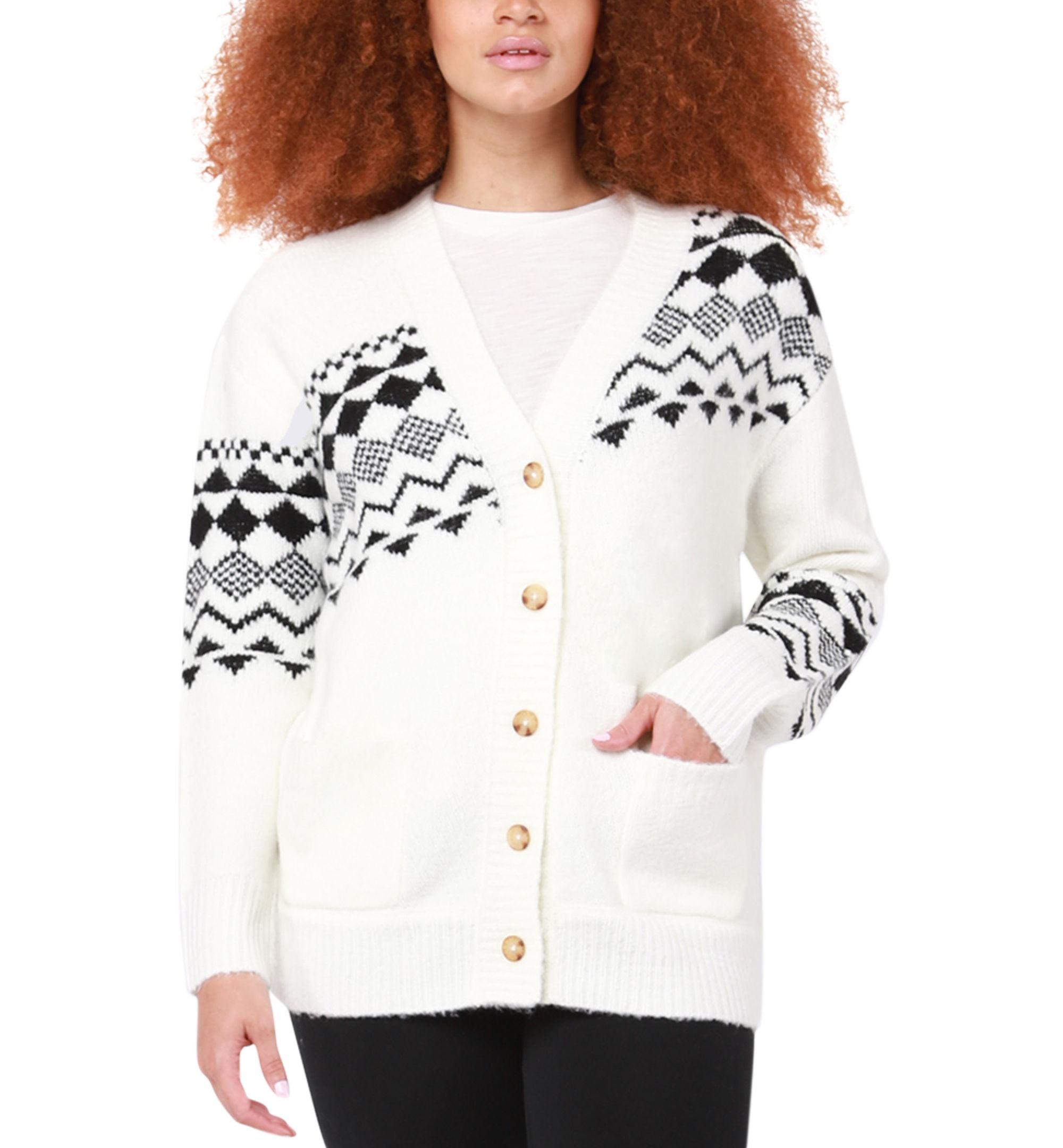 Geometric intarsia-knit detail at yoke and sleeves; patch pockets at front
