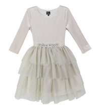 This velvet-textured bodice to tiered mesh skirt is perfect for her. 3/4 sleeve Stretch velvet bodice 4-tier shimmer mesh skirt Velvet ribbon and jewel trim at waist Upper Body- Polyester, Spandex, Lower Body and Lining- 100% Polyester Machine Washable Imported