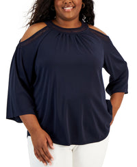 Show off a hint of skin with Tommy Hilfiger's plus size cold-shoulder top. Imported 3/4-sleeves with cold-shoulder cutouts Cutout trim at neck and shoulders Crewneck Hits at waist; approx. 28" long Polyester Machine wash